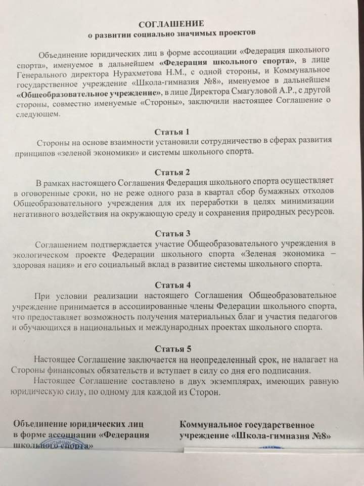 Подписание соглашения по развитию социально значимых проектов шг # 8 с Федерацией школьного спорта по развитию принципов ,,зелёной экономики ‘’в рамках проекта ,,Зелёная экономика -здоровая нация ‘’.