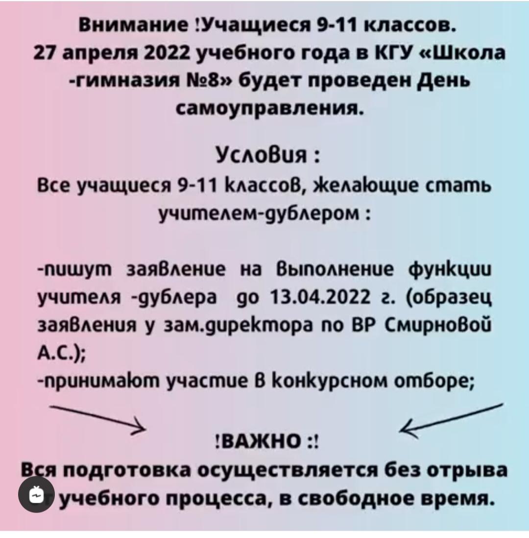 09 сәуір 2022 0 1 2 3 4 5 Внимание! Внимание! 27 апреля 2022 года Школьным Парламентом будет проведен День самоуправления. Приглашаем учащихся 9-11 классов принять участие в качестве учителей-дублеров.