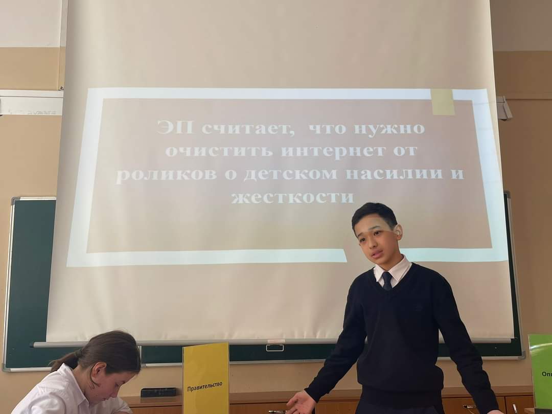8-сыныптардың оқушылары арасында «Зұлымдықсыз, зорлық-зомбылықсыз балалық шақ» акциясына орай жарыссөз турнирі. Турнир АПФ форматында өткізілді. «ЭП ғаламторды балалар зұлымдығы мен зорлық-зомбылығы жайлы роликтерден тазарту керек деп есептейді» қарары.