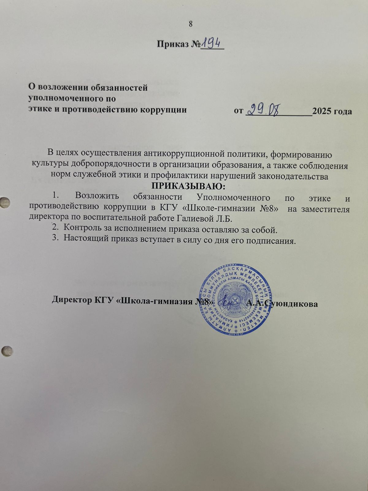 29 қыркүйек 2025 0 1 2 3 4 5 Әдеп және сыбайлас жемқорлыққа қарсы іс-қимыл жөніндегі уәкілдің міндеттерін жүктеу туралы! О возложении обязанностей уполномоченного по этике и противодействию коррупции!