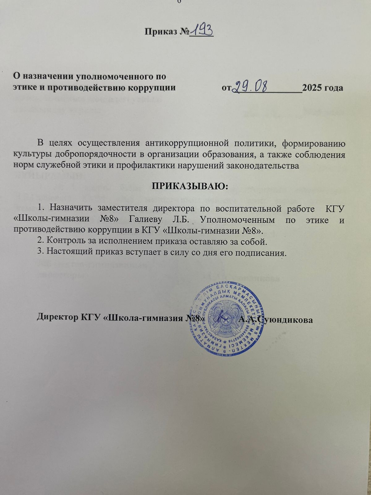 29 қыркүйек 2025 0 1 2 3 4 5 Әдеп және сыбайлас жемқорлыққа қарсы іс-қимыл жөніндегі уәкілді тағайындау туралы! О назначении уполномоченного по этике и противодействию коррупции!