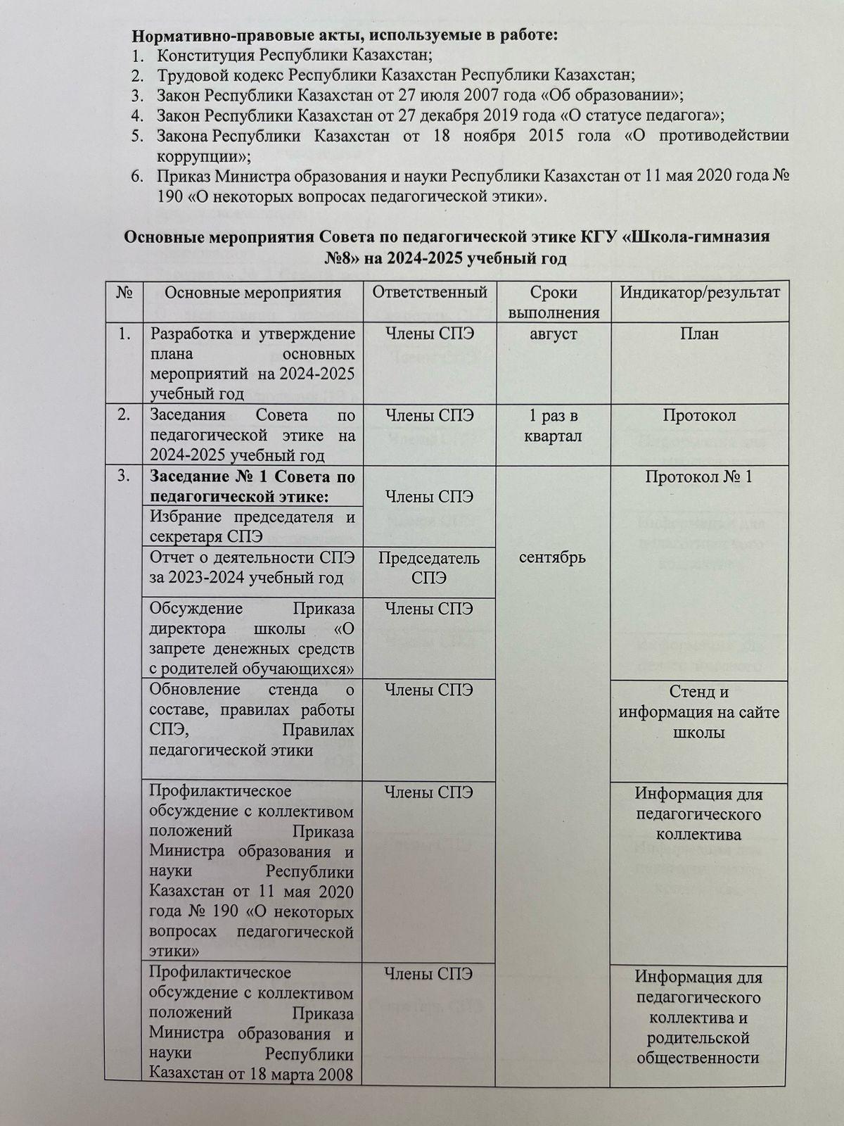 "№8 мектеп-гимназия" КММ жұмыс жоспары! План работы КГУ "Школа-гимназия №8"!