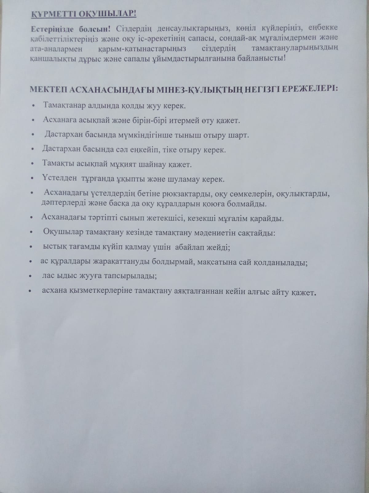 Оқушылардың тамақтану кестесі кестесі!График питания учащихся!