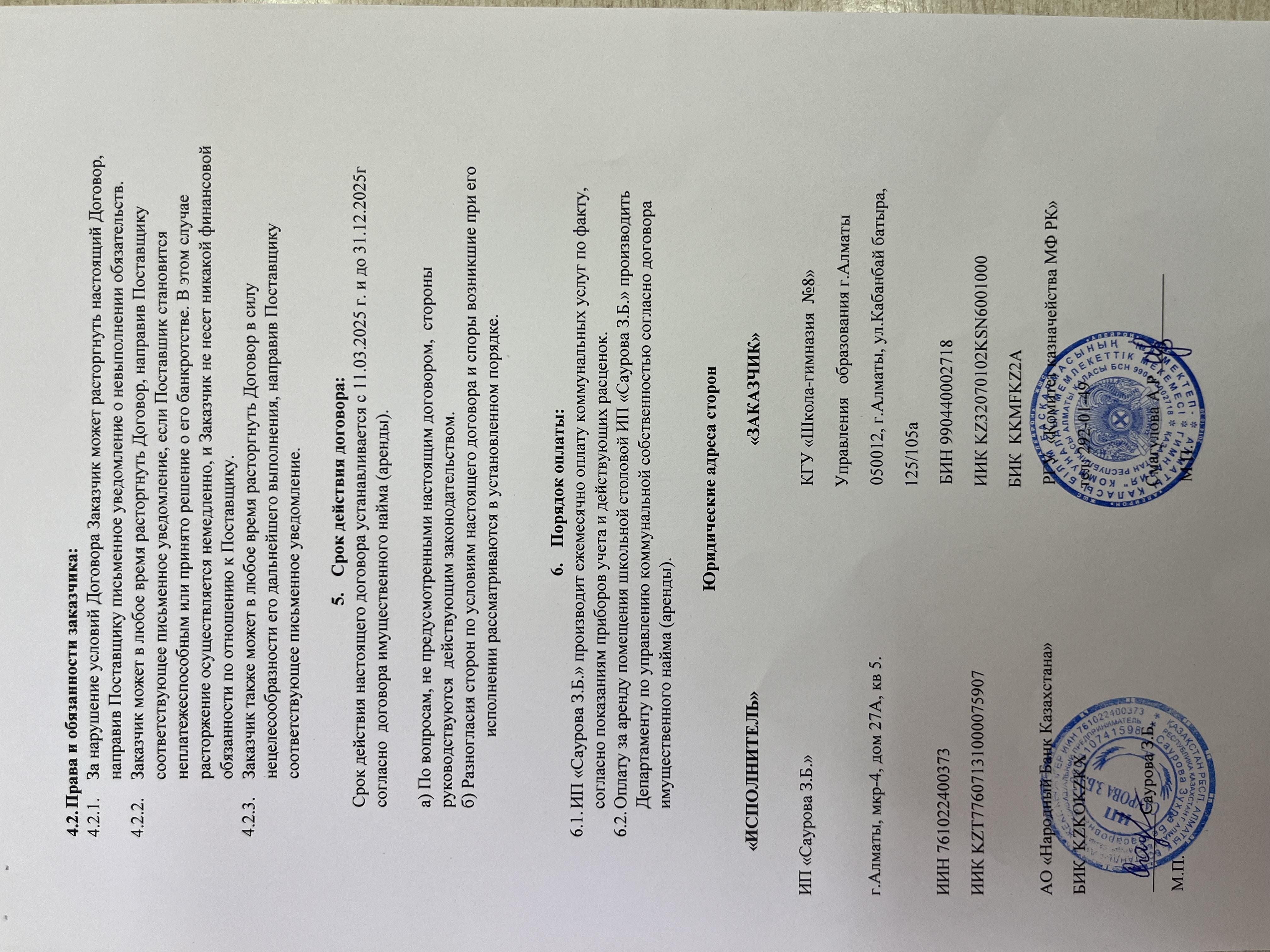 №8 МЕКТЕП-ГИМНАЗИЯ ОҚУШЫЛАРЫ МЕН ҚЫЗМЕТКЕРЛЕРІ ҮШІН ҚОҒАМДЫҚ ТАМАҚТАНДЫРУ ҰЙЫМДАСТЫРУ ТУРАЛЫ КЕЛІСІМШАРТ. ДОГОВОР ОБ ОРГАНИЗАЦИИ ОБЩЕСТВЕННОГО ПИТАНИЯ ДЛЯ УЧАЩИХСЯ И СОТРУДНИКОВ КГУ "ШКОЛА-ГИМНАЗИЯ №8"